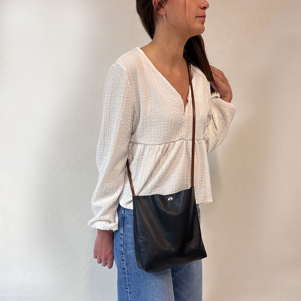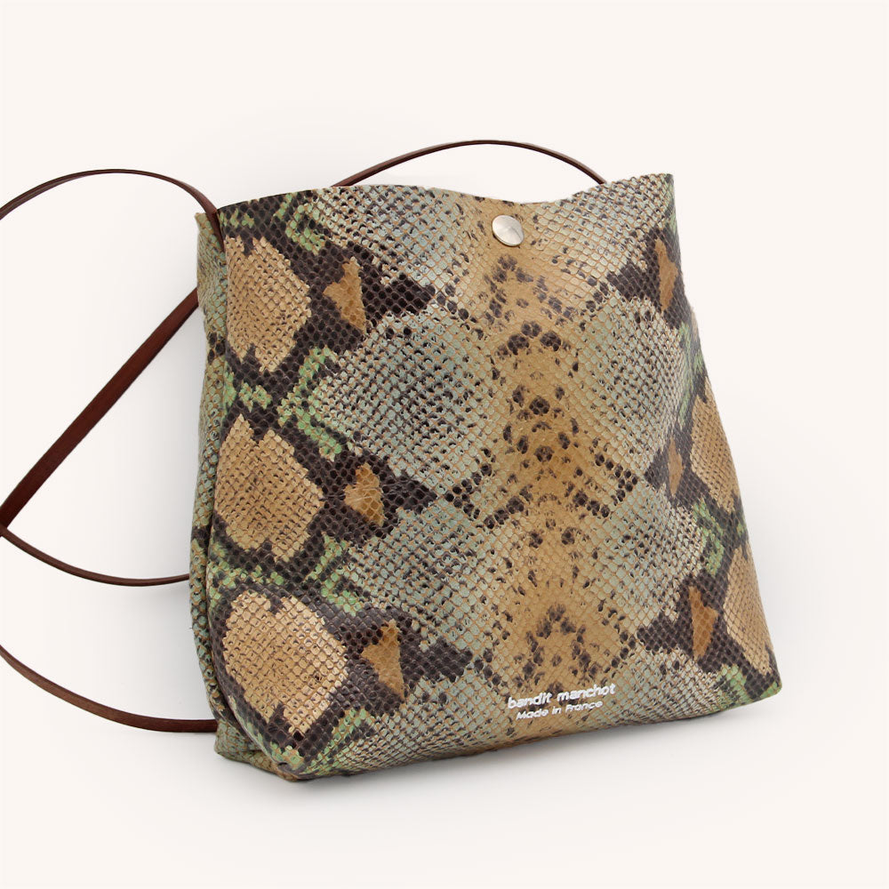 This snap-on bag is made from recycled leather. This model allows you to have your hands free thanks to its crossover design.