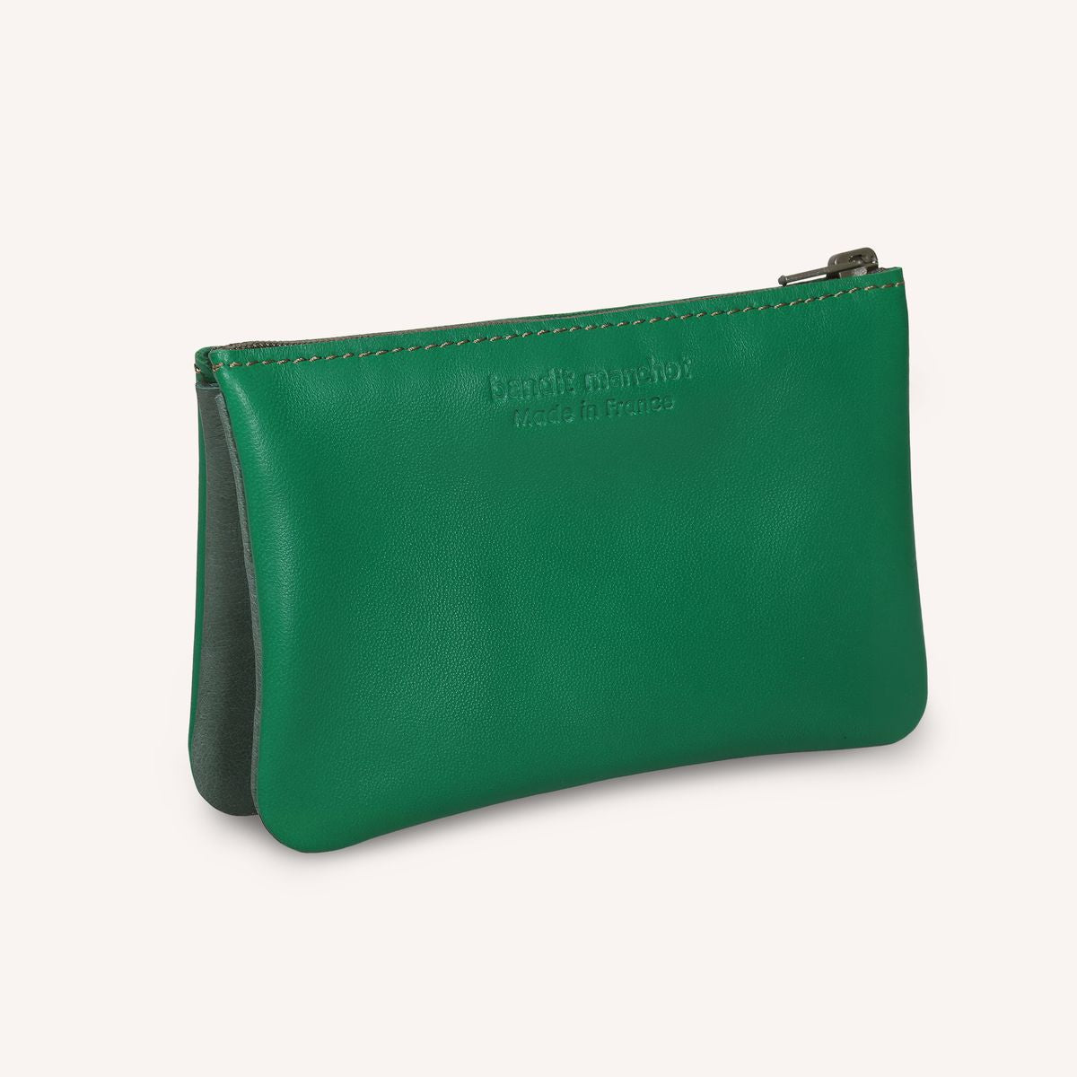 This pouch features two side compartments made of reinforced leather, separated by a central card slot . It closes with a sturdy yet discreet khaki zipper . A contrasting gusset completes the design and ensures a wide opening . This unique format allows you to carry and organize papers, cash, cards, keys, or earphones without taking up too much space. Flexible and lightweight , it slips easily into a bag, fanny pack, tote, or suitcase.