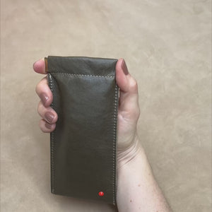 This leather eyeglass case features a wide opening thanks to its metal click-clack clasp. A red rivet adorns the front. Made in our Tarn workshop.
