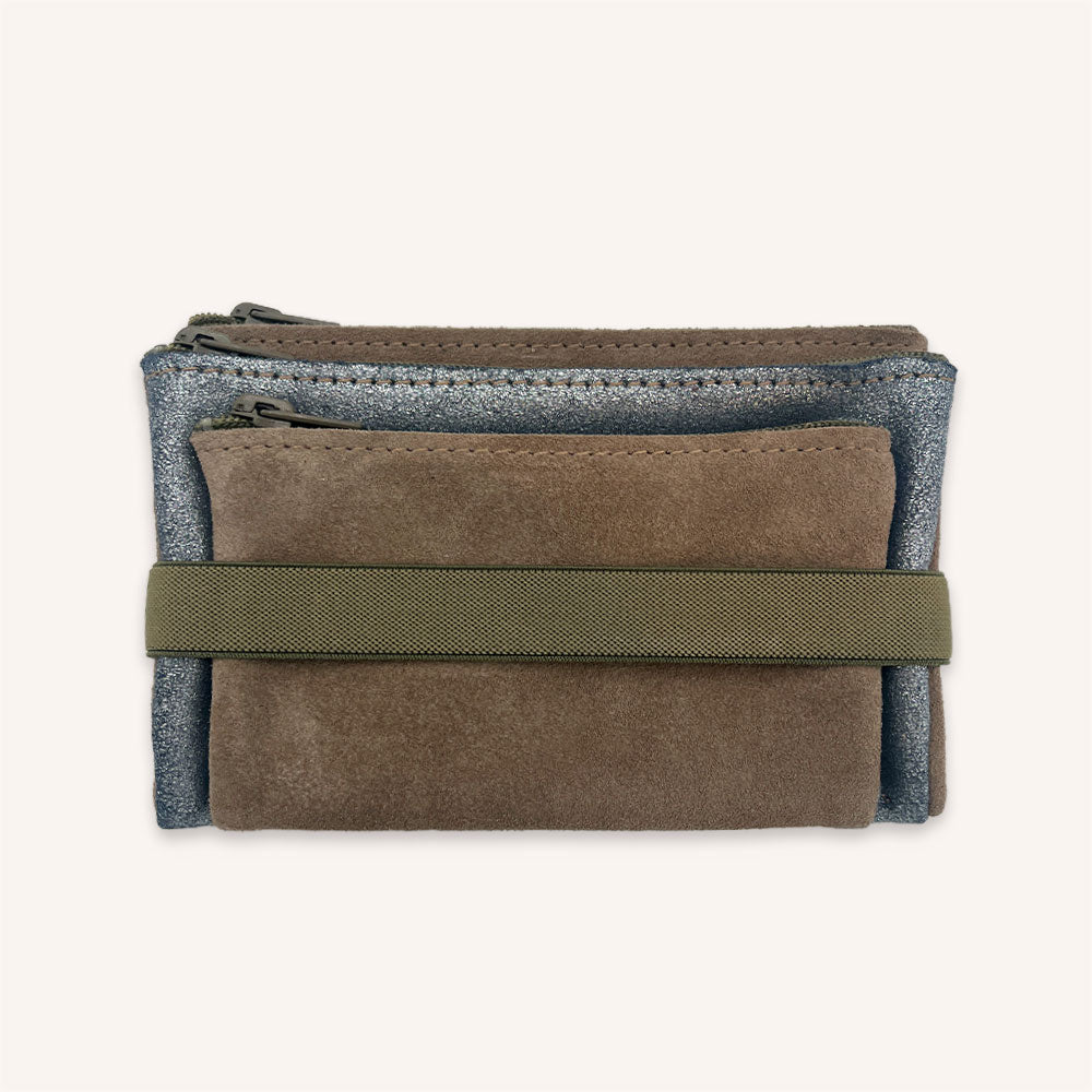 This leather pouch features three separate zippered pockets held together by a simple yet stylish khaki elastic band. It allows you to efficiently organize your belongings: coins, cards, papers, earphones, medication, or small makeup items. Compact and easy to handle, it can be used as a wallet, purse, or travel companion . Unlike its cousin, the Siamese Pouch M , it is not reversible, but it offers even more storage space.