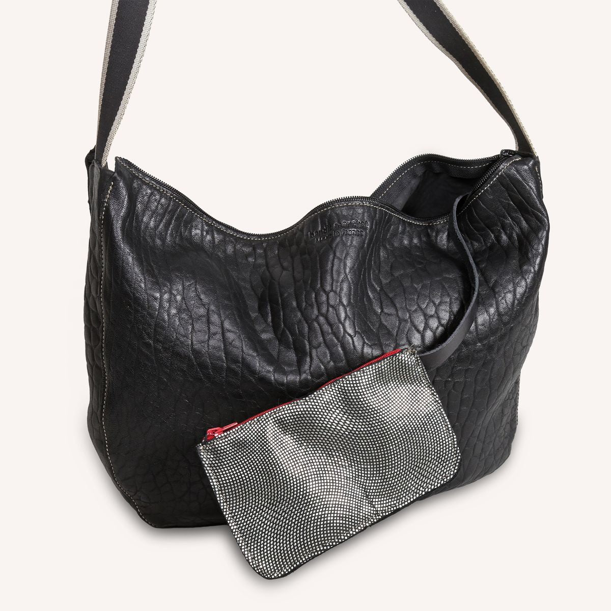 Légère, spacieuse et raffinée, la Besace Plume L Bandit Manchot est l'alliée des journées chargées. Dotée d’une bandoulière en sangle, réglable par un nœud, elle se porte confortablement à l’épaule ou en travers du corps.