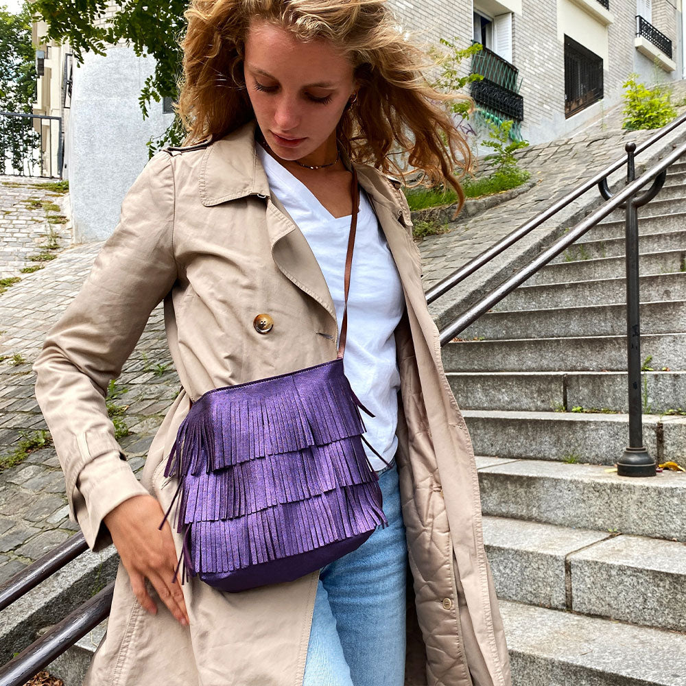 Le Crossbody Woodstock est idéal pour accessoiriser une tenue sobre ou accompagner un look bohème chic. Sa forme verticale et ses franges lui donnent du mouvement et une vraie personnalité.
