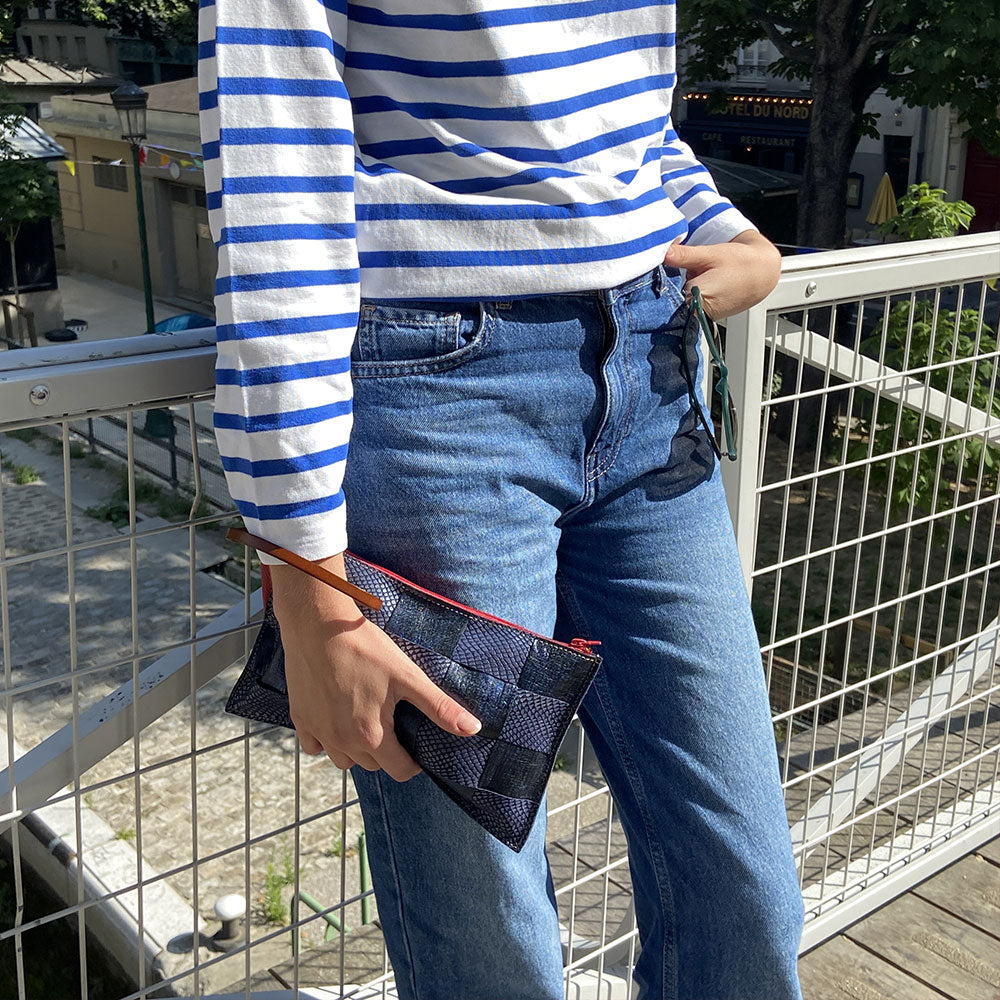 Cette pochette tressée est en cuirs ressourcés bi-matières. Ce modèle possède une dragonne pour un porté en toute liberté. Pièce fabriquée dans notre atelier du Tarn.