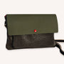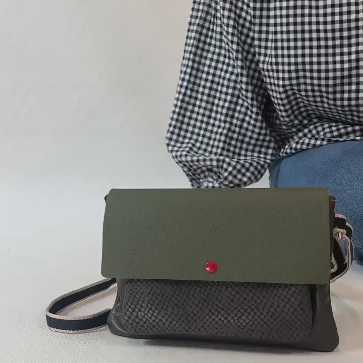 Ce sac banane se distingue par les harmonies coloriées de cuirs ressourcés. Ce modèle est fermé par un rabat à pression sous lequel se trouve 2 compartiments zippés et un compartiment pour les cartes. Pièce fabriquée dans notre atelier du Tarn.