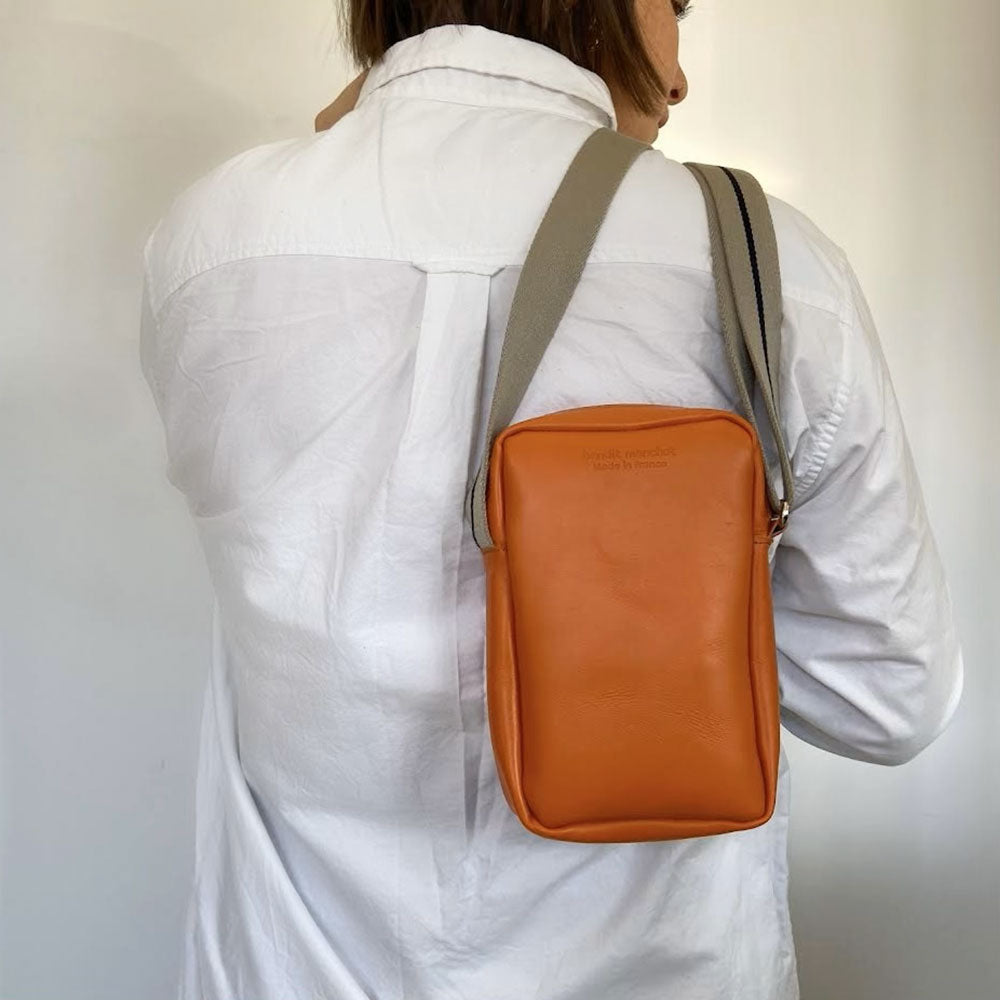Ce trotteur en cuir ressourcé se porte comme une banane. Il se ferme par un zip kaki. La sangle en coton est réglable. Pièce fabriquée dans notre atelier du Tarn.
